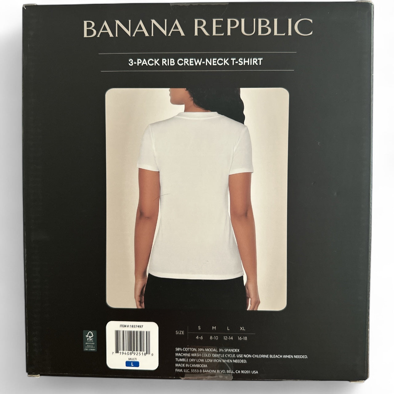 Features: • Banana Republic® • Pack includes: (1) Black (1) White (1) Heather Gray • Made in Cambodia Content: • 58% Cotton | 39% Modal | 3% Spandex • Approximately 215 GSM • Midweight Sizing: • Sizes: L • Size Conversion: L = 10-12 16 • Model is 5'9" wearing size Medium Care Instructions: • Machine washable • Use non-chlorine bleach when needed • Tumble dry low
