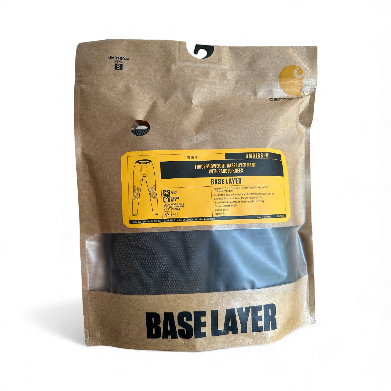 Top highlights Fabric type 96% Polyester, 4% Spandex Care instructions Machine Wash Origin Imported Closure type Pull On About this item • French terry fabric base layer bottoms for cool weather with added cushioning at knees; 210 GSM/ 6.2oz • Fast Dry wicks away sweat; Rugged Flex moves with you; fights odor • Breathable pads at knees provide flexible, comfortable coverage; strategically-placed flatlock seams reduce chafing • Brushed elastic waistband with concealed stitching; contoured front with fly • Tagless labels; Model No. UM0139-M Description Carhartt Men's Force Midweight Base Layer Pant with Padded Knees (Model No. UMO139-M) are base layer bottoms for cool weather with added cushioning at knees. Designed to keep you warm, dry, and comfortable, these men's thermal bottoms use FastDry and Rugged Flex technologies and odor-fighting fabric. FastDry wicks away sweat and Rugged Flex is for ease of movement, giving your legs a full range of motion. Color: Charcoal Heather