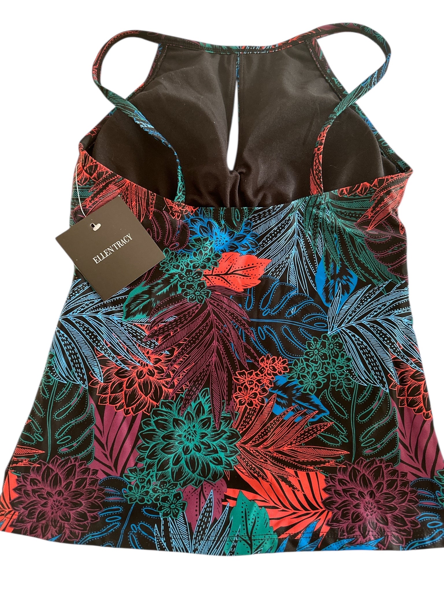 Vibrant floral halter neck top featuring a stunning mix of colors. Perfect for adding a pop of color to your wardrobe. Ellen Tracy tankini top, size 6, featuring a vibrant floral pattern in black, blue, orange, and red. It has a high neck with a keyhole detail at the front and a built-in bra for support. The tankini is made from a blend of 82% nylon and 18% spandex, with a 100% polyester lining. The measurements are approximately 13 inches across the underbust and 22 inches in length. This tankini is suitable for swimming and can be worn at the pool or beach