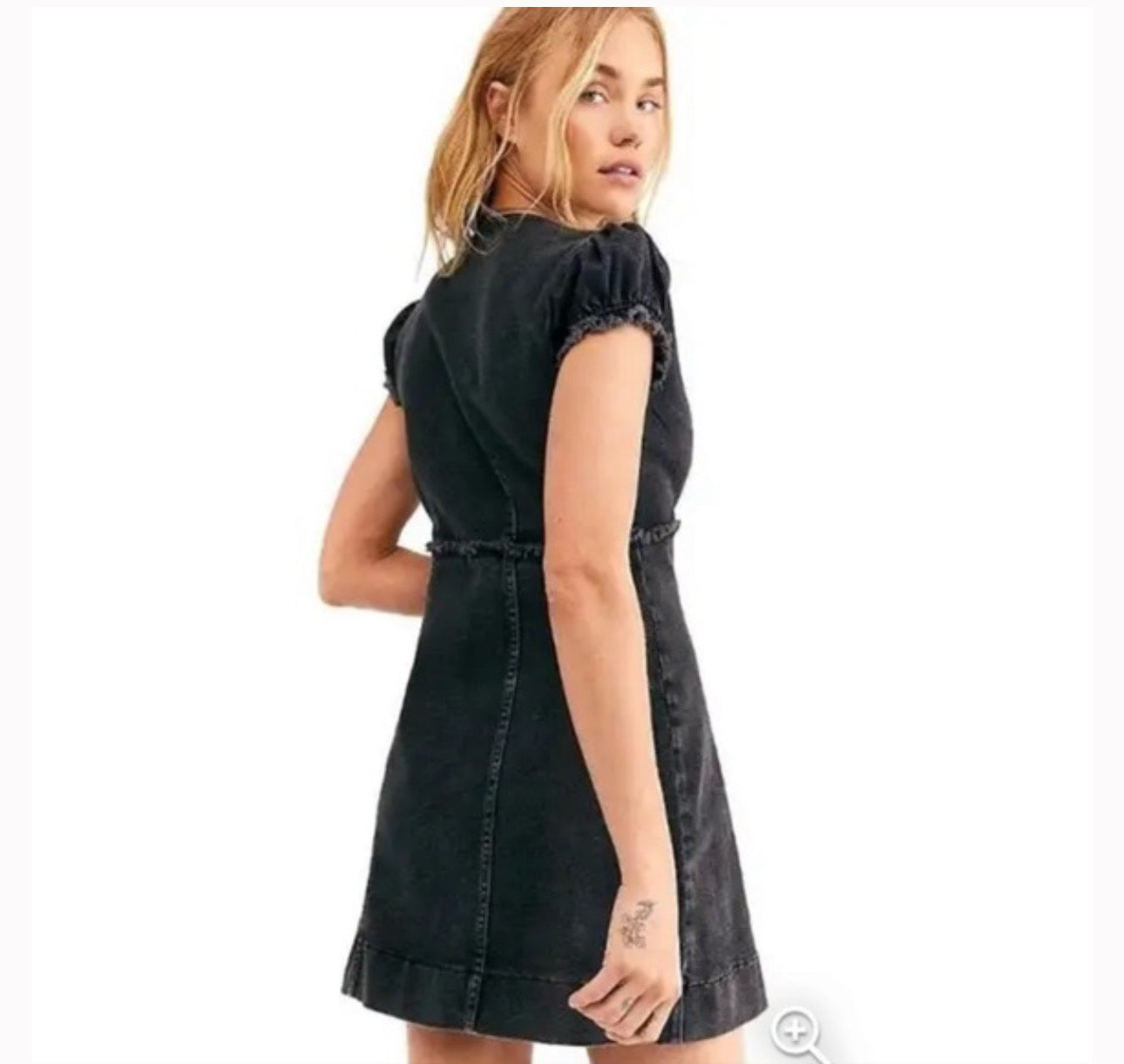 The "Free People Something Sweet Mini" is a black stretch denim dress with a low V-neck and lace-up detailing at the waist. It features an A-line silhou-ette, short puffed sleeves, and yoking throughout, adding to its unique design. The dress is made from a blend of 93% cotton, 5% polyester, and 2% elastane. & Here's a more detailed description: • Material: Stretch denim, specifically black stretch denim. • Style: A-line silhouette, mini length, and a low V-neck with lace-up detailing. • Sleeves: Short, puffed sleeves. • Details: Yoking throughout, adding to the dress's texture and style. • Fabric Composition: 93% cotton, 5% polyester, 2% elastane. • Care Instructions: Machine wash cold.
