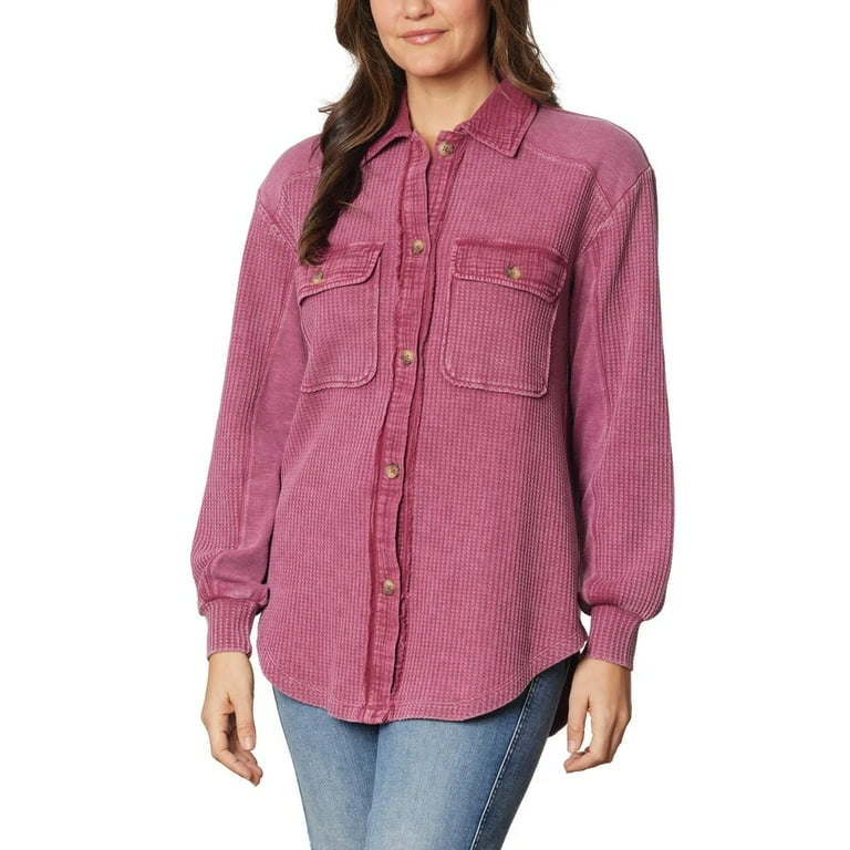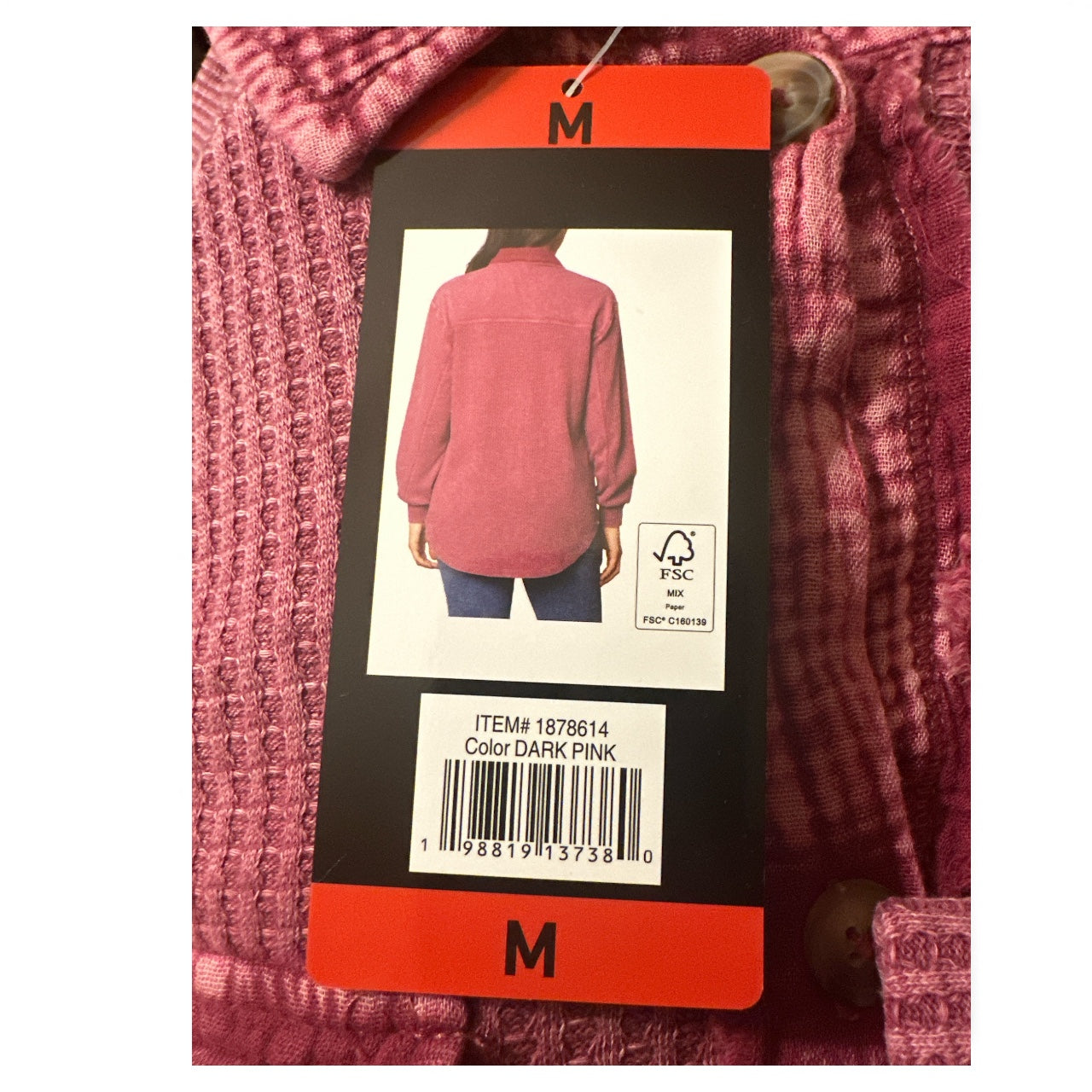 Colors: Dark Pink (Very Berry) Waffle Texture Fabrication MTwo Front Patch Pockets Ribbed Cuffs Relaxed fit Long sleeve Dropped shoulder Rounded hem Made in China Content: Body: 57% Cotton | 40% Polyester | 3% Spandex Rib: 58% Cotton | 39% Polyester | 3% Spandex Collar/Placket: 100% Cotton Waffle: Approximately 250 GSM Slub Rib: Approximately 210 GSM Cotton Double Gauze: Approximately 125 GSM Midweight Sizing: Sizes: M Size Conversion: M = 8-10