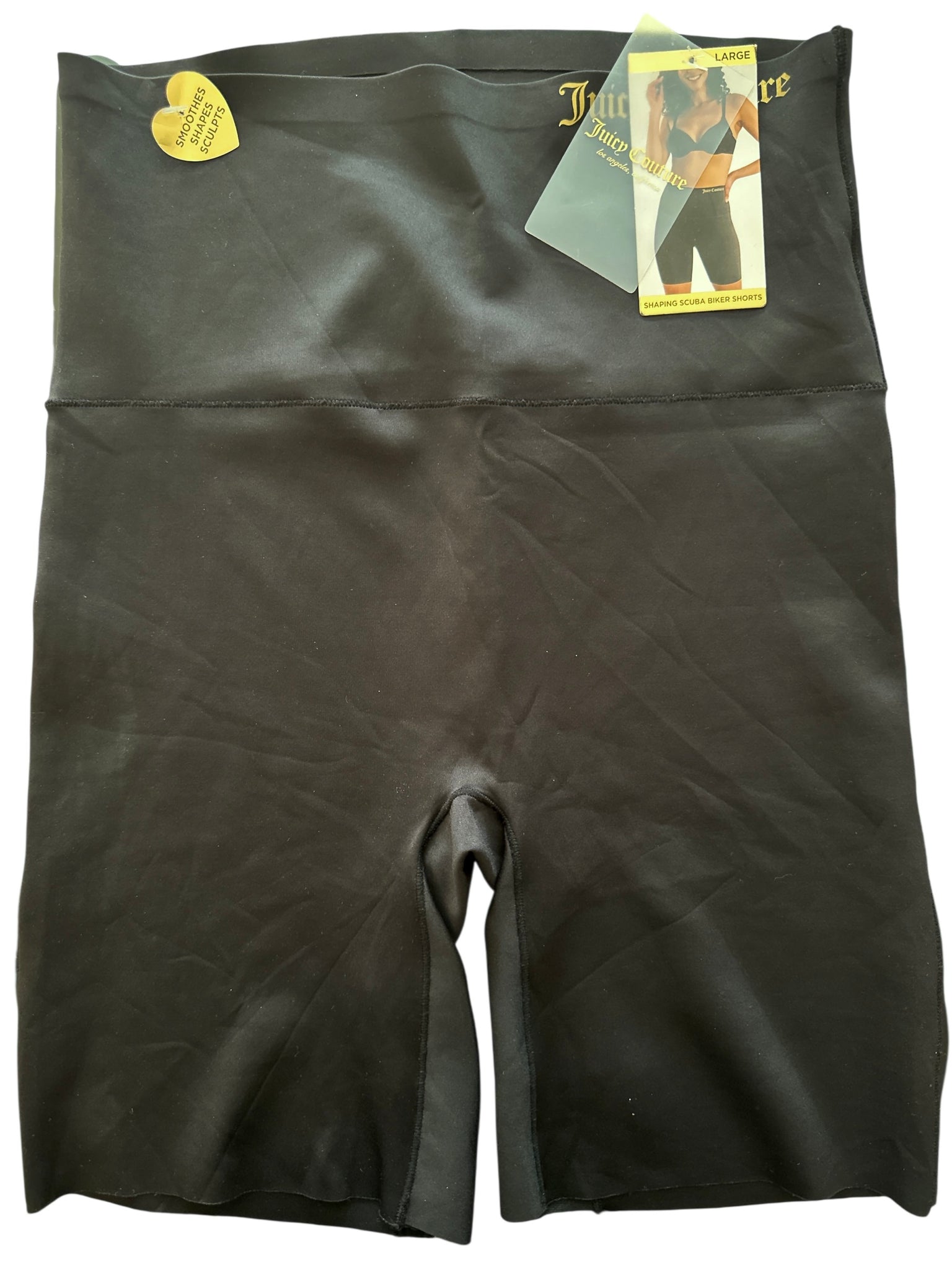 Designed to smooth, shape, and sculpt. Product Details: • Brand: Juicy Couture. • Style: Body Shaping Scuba Biker High Shorts. • Features: High-waisted design to smooth the tummy area and thigh shapers for coverage and support. • Material: Typically made with a blend of nylon and spandex (e.g., 82% Nylon, 18% Spandex). • Functionality: Provides mild compression targeting areas such as the buttocks, waist, and abdomen, offering a slimming and breathable fit.
