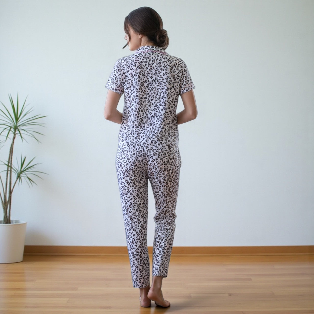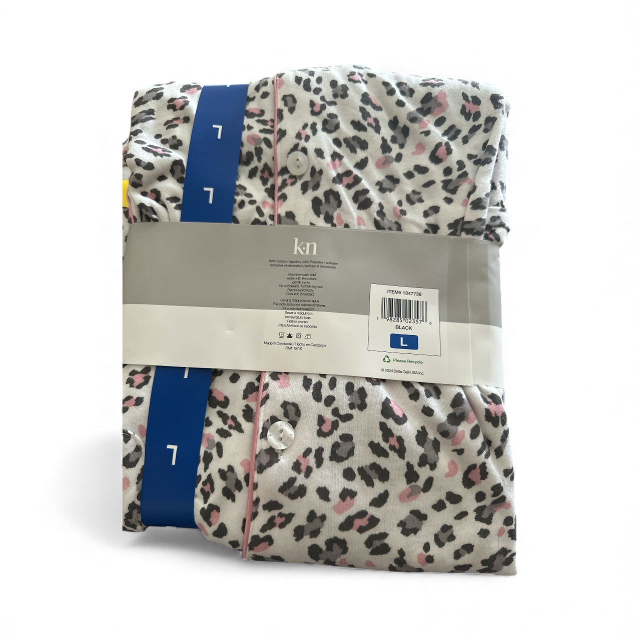 Chic animal print pajamas for ultimate comfort. Short-sleeve top with matching pants. 60% Cotton / algodón, 40% Polyester / poliéster exclusive of decoration / excluye la decoración Machine wash cold water with like colors, gentle cycle. Do not bleach. Tumble dry low. Remove promptly. Cool iron if needed Lavar a máquina con agua Fría ciclo lento con colores similares. No usar blanqueador. Secar a máquina a temperatura baja. Retirar pronto. Plancha fría si se necesita.