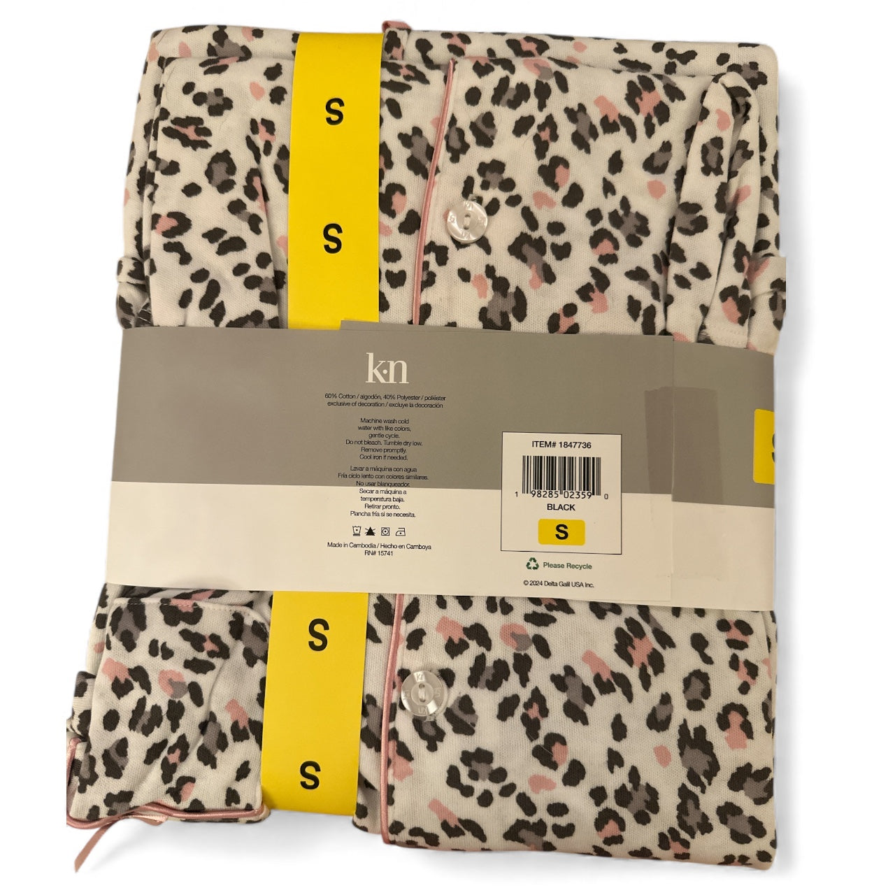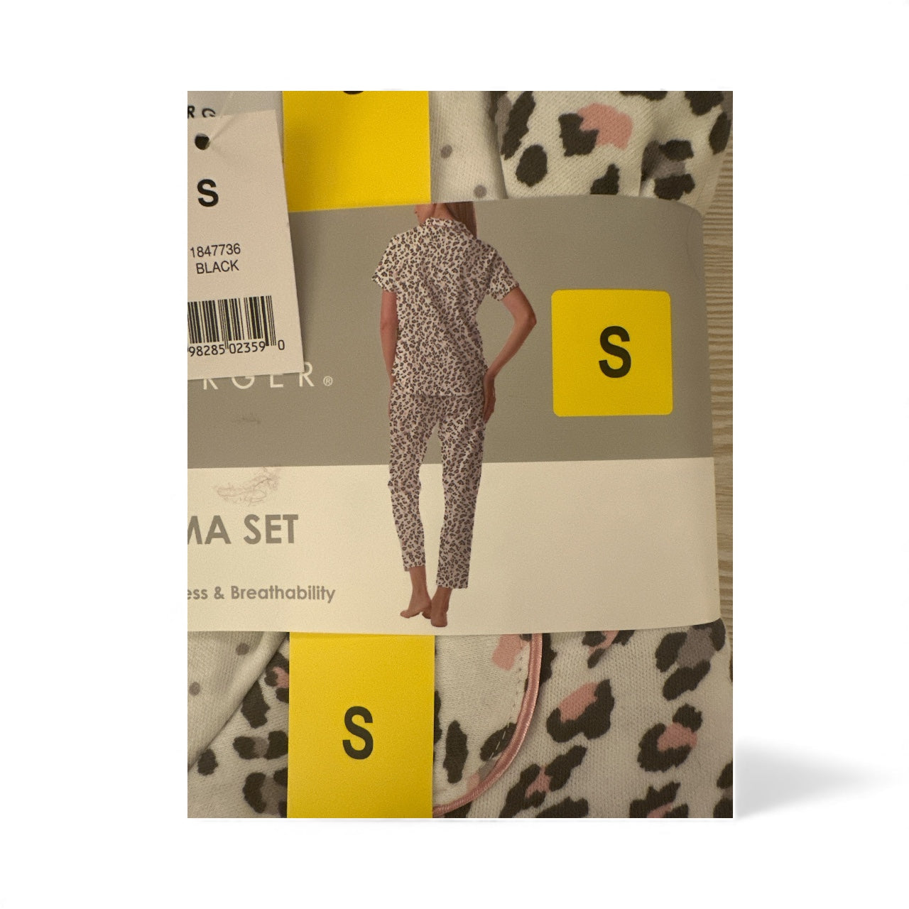 Chic animal print pajamas for ultimate comfort. Short-sleeve top with matching pants. 60% Cotton / algodón, 40% Polyester / poliéster exclusive of decoration / excluye la decoración Machine wash cold water with like colors, gentle cycle. Do not bleach. Tumble dry low. Remove promptly. Cool iron if needed Lavar a máquina con agua Fría ciclo lento con colores similares. No usar blanqueador. Secar a máquina a temperatura baja. Retirar pronto. Plancha fría si se necesita.