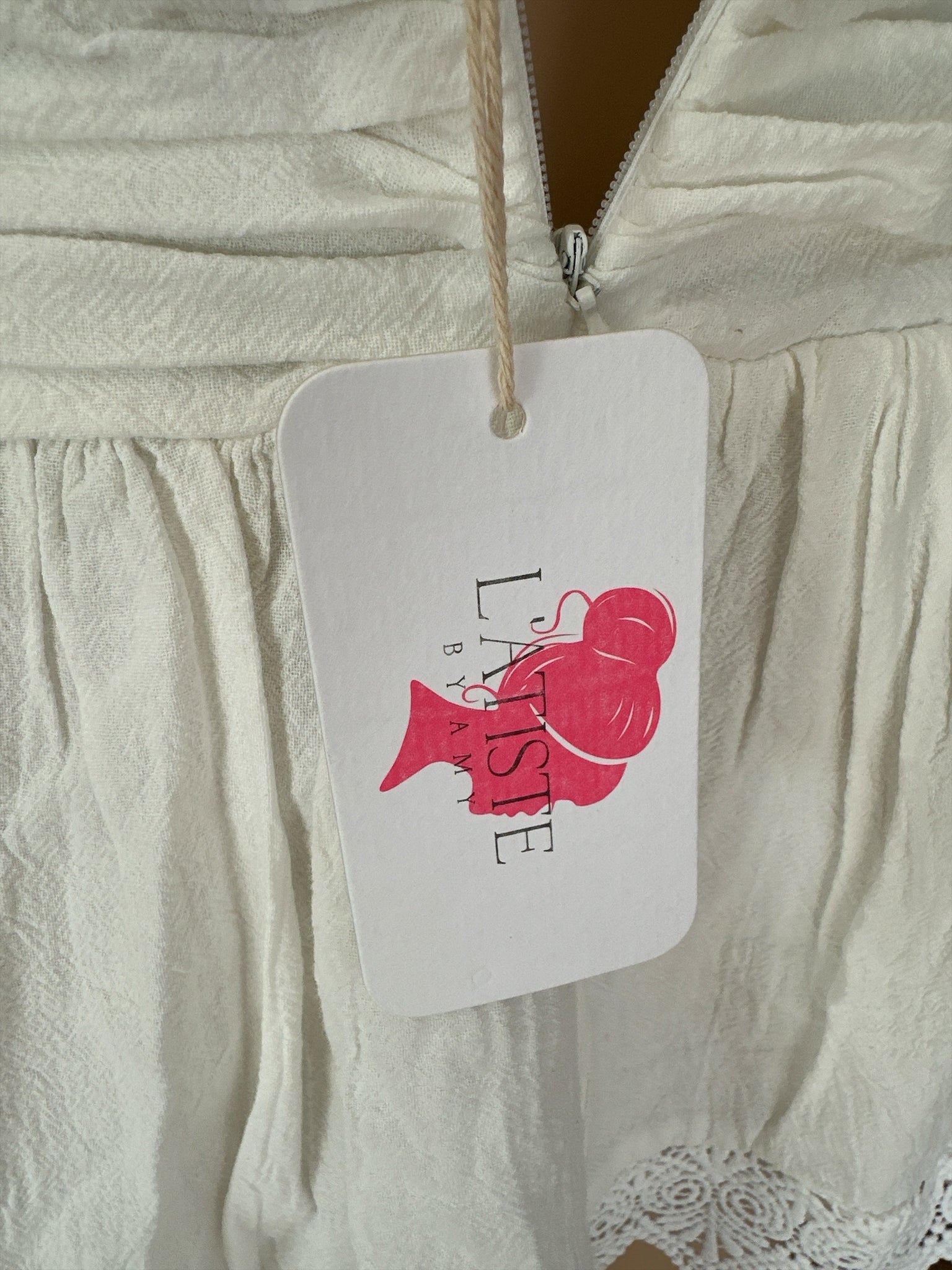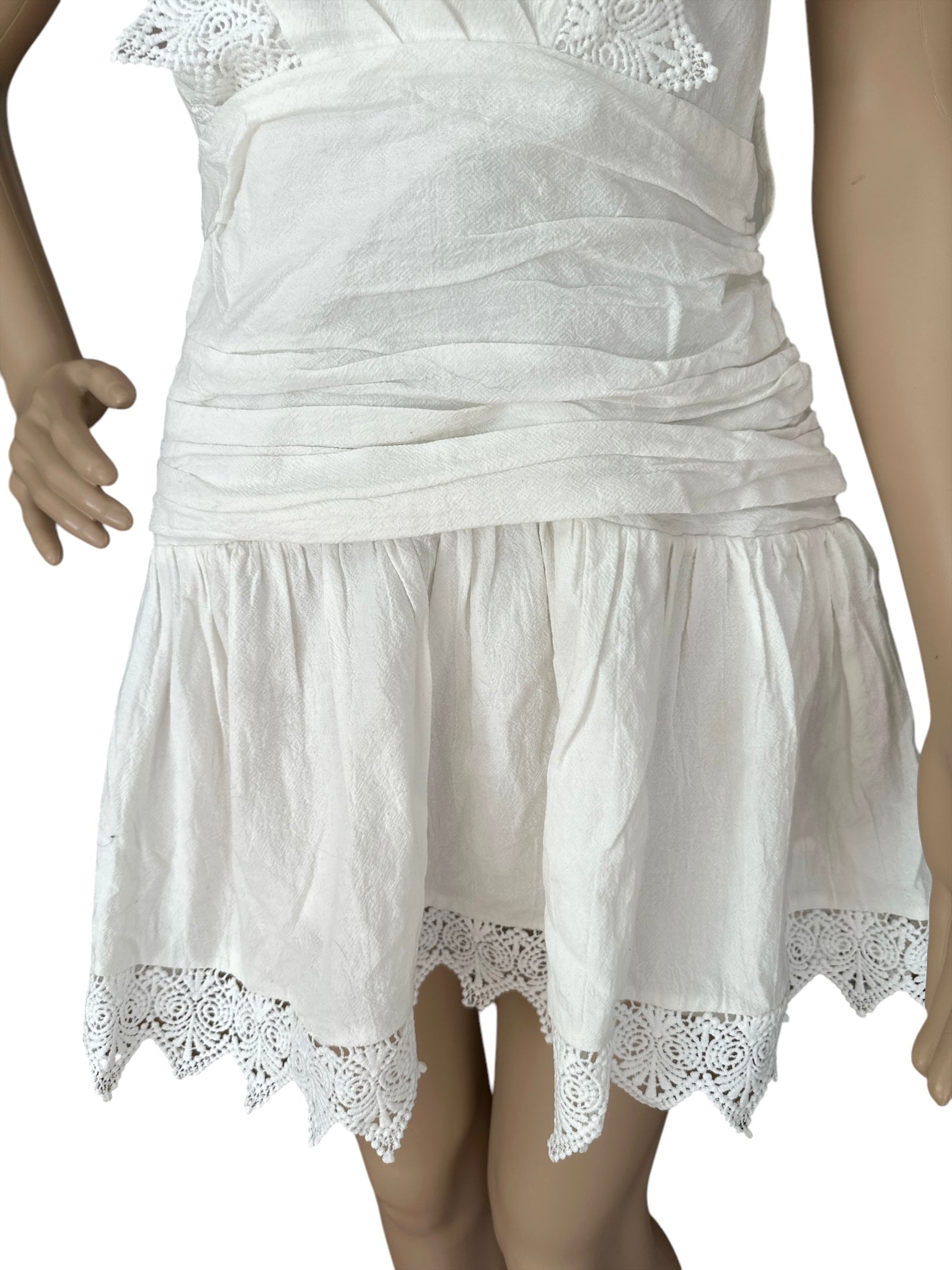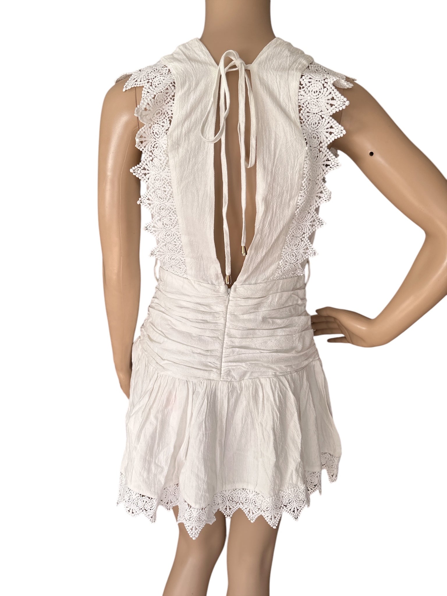 Sexy and sweet, this White Crocheted Lace Sleeveless Mini Dress boasts a plunging V-neck atop a self-tie bow that cinches the waist and tops a ruched drop waist complete with a flare hem. Crocheted lace trim frames the sleeves and the bottom hem. • Invisible zipper closure in back • Lining in skirt • Self & Lining: 100% Cotton