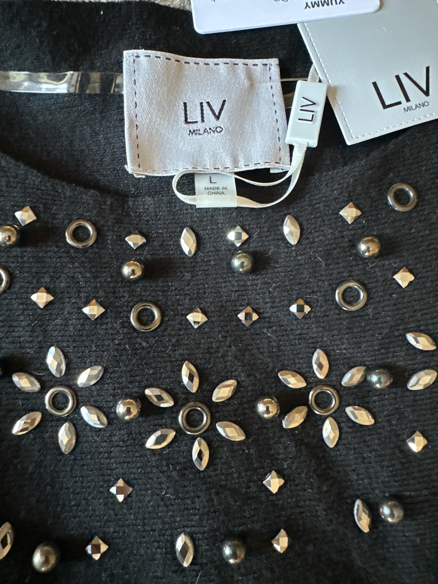 Elevate your style with the Black Embellished Women's Top. This chic top features intricate embellishments for a touch of elegance. Perfect for any occasion. This is a women's black pullover sweater by Milano, made of polyester, nylon, and viscose knit fabric with a boat neckline and long sleeves. It features rhinestone accents and is lightweight, suitable for all seasons. The size is large, and the care instructions recommend hand washing. Perfect for parties, casual wear, or business settings in winter, fall, or spring