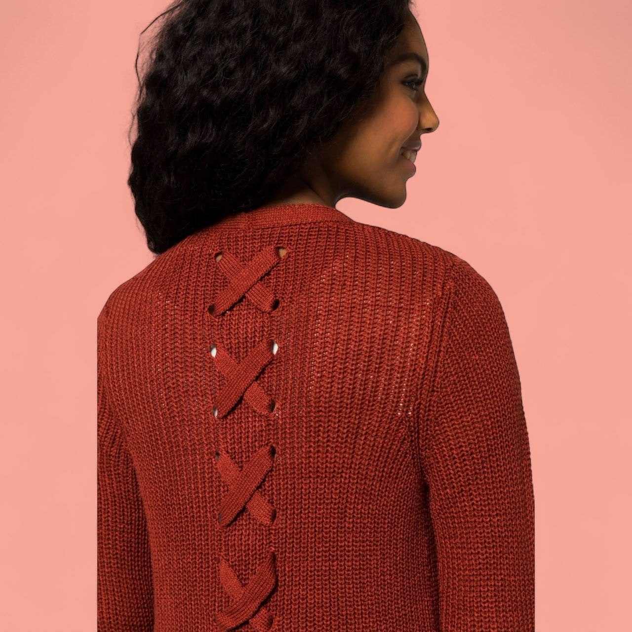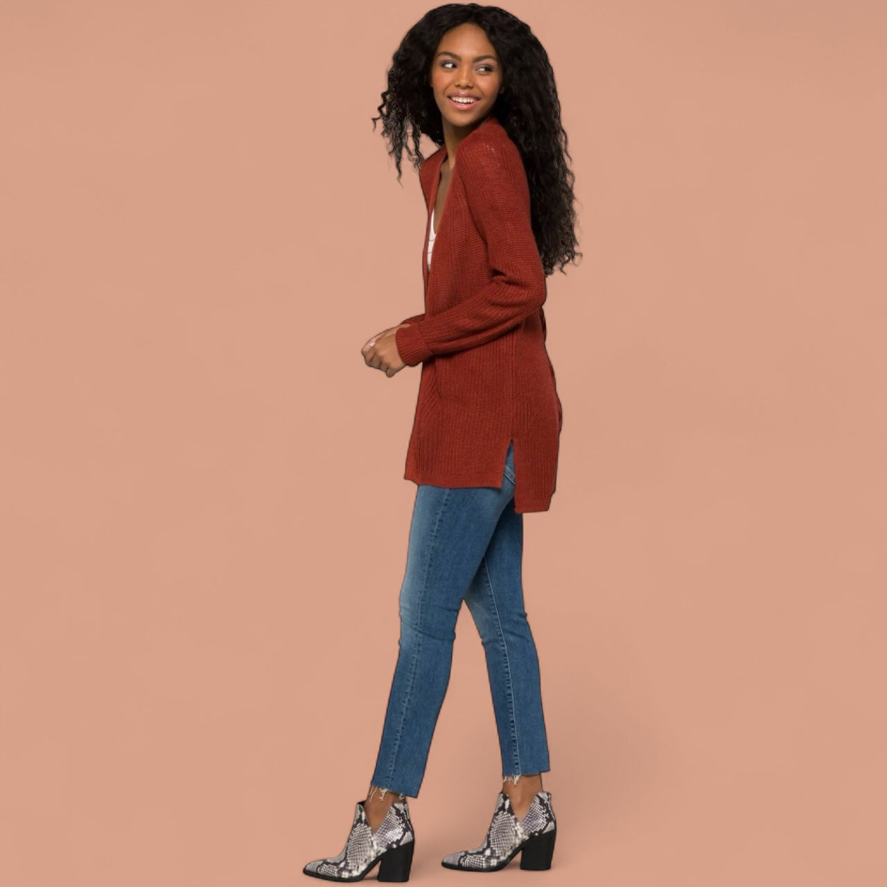 Chic rust cardigan by Pinque authentic from Stitch Fix. Open-front design. Ideal for layering. "Add a stylish touch to your everyday wardrobe with this Pinque Jamelya Back Detail Cardigan. The criss-cross back design make this cardigan easy to wear, while the loose fit and long sleeves make it a versatile choice for work or home." Open in front, knit, shorter in front longer in back with a criss cross design. 100% Acrylic Hand Wash Cold