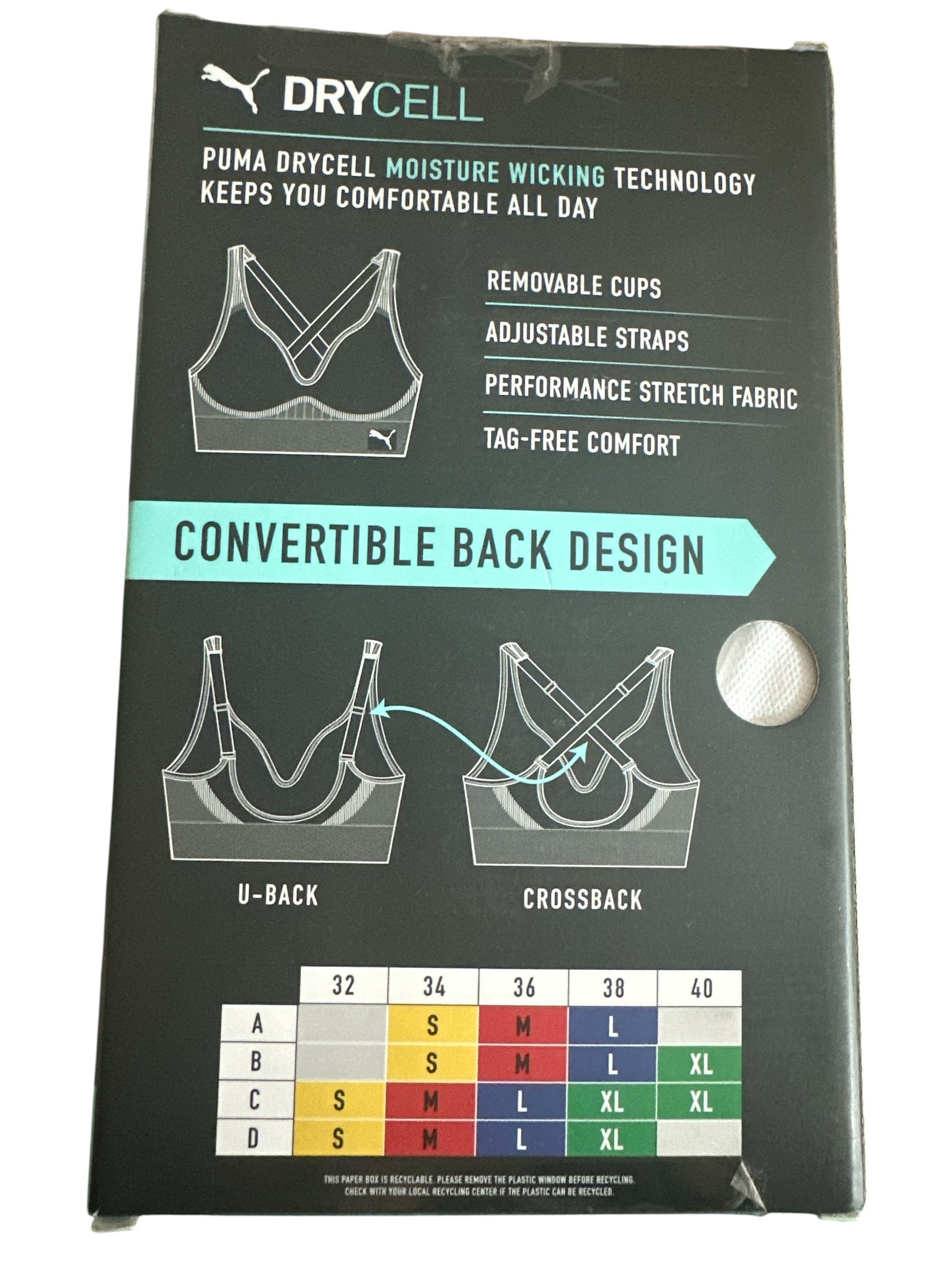 Puma sports bra with V-neck. Convertible back design: (U-Back/Cross Back) Moisture-wicking fabric. Removable cups and adjustable straps. Tag Free Comfort. PUMA Womens Comfortable Seamless Sport Bras (Black/White, Medium) • Moisture wicking • Removable cups • 92% Nylon |7% Lycra Spandex | 1% Other . Machine Wash Cold • Model is wearing size M
